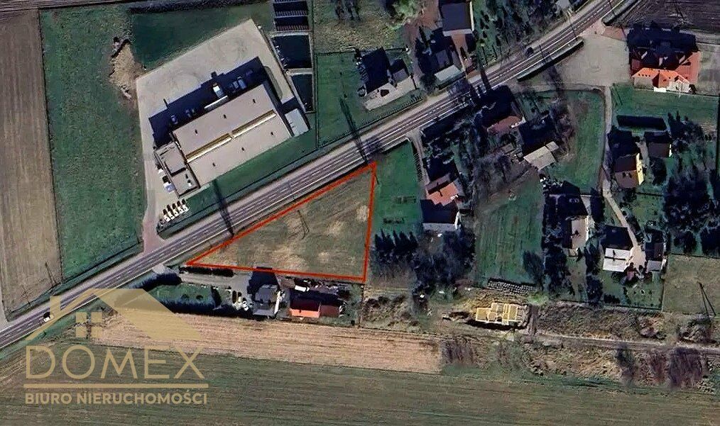 Działka budowlana w kształcie trójkąta pod zabudowę jednorodzinną + możliwość usług (rzemiosło, handel, biura, sport/rekreacja - zgodnie z MPZP).